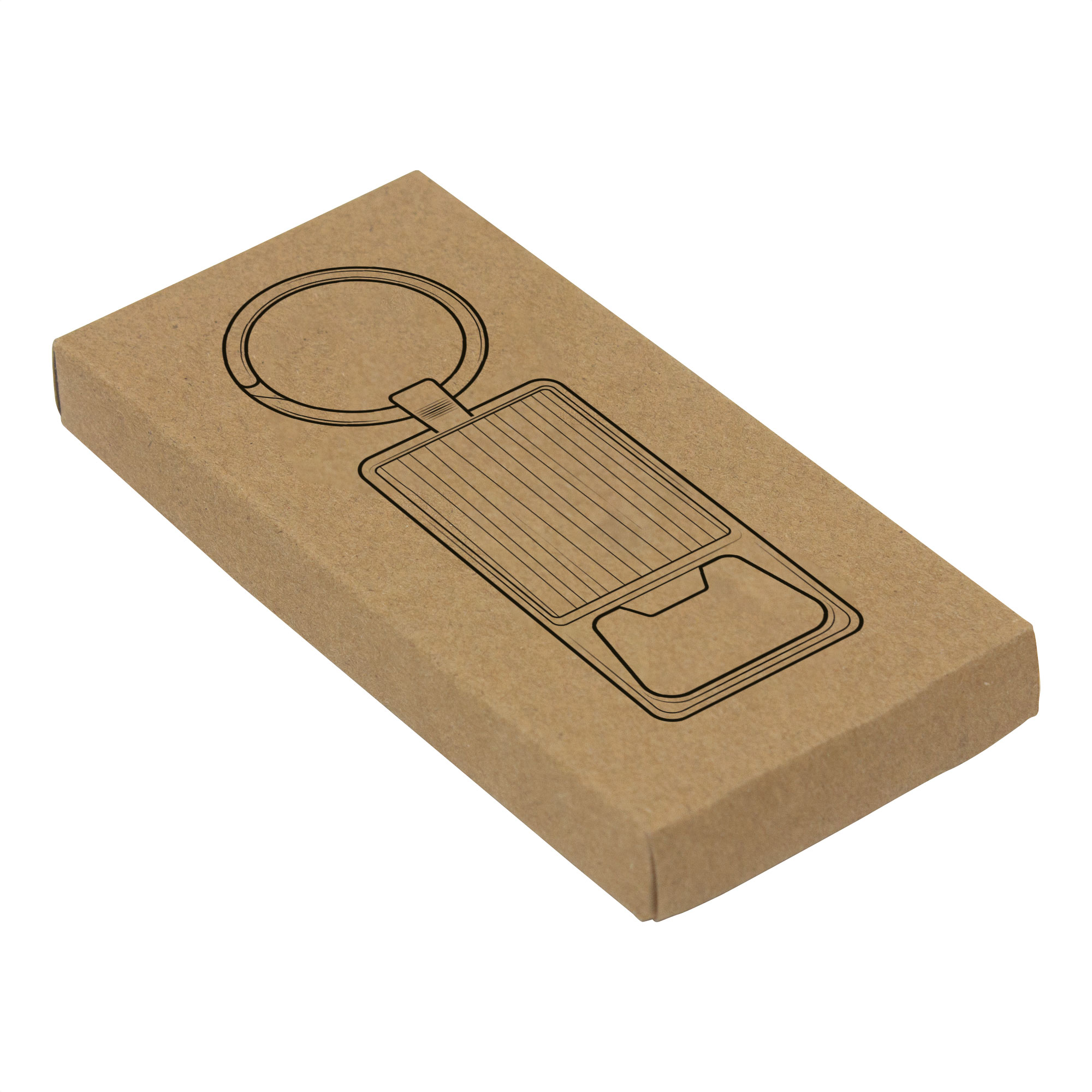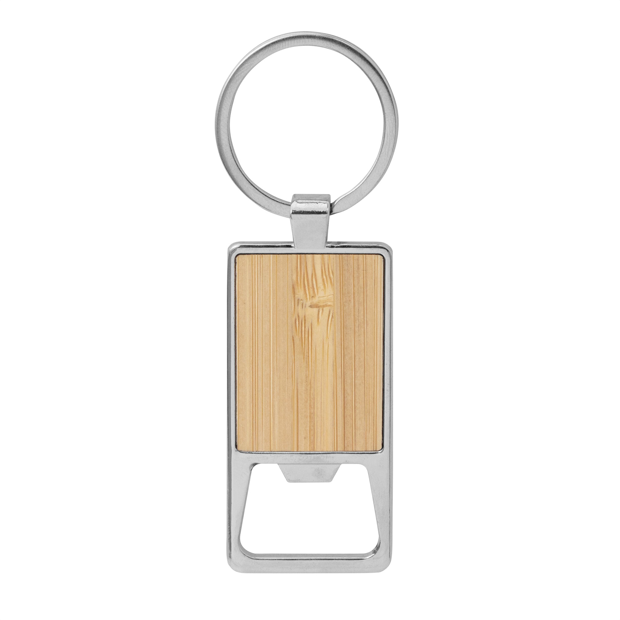 Llavero con destapador abre botellas. Estructura metálica con aleación de zinc con acabado brillante y panel frontal de bambú barnizado