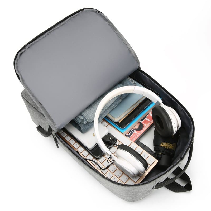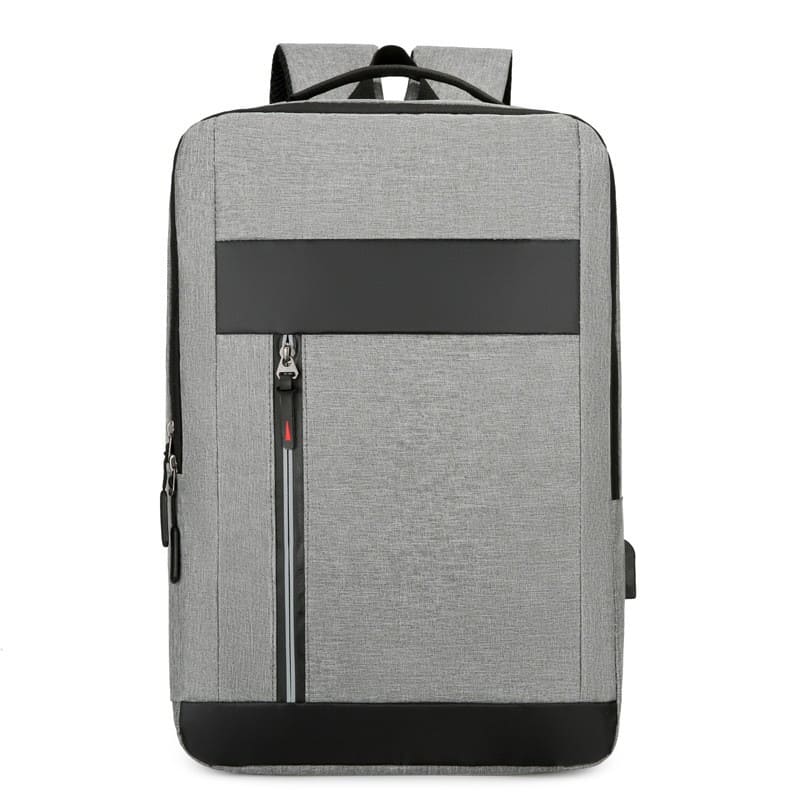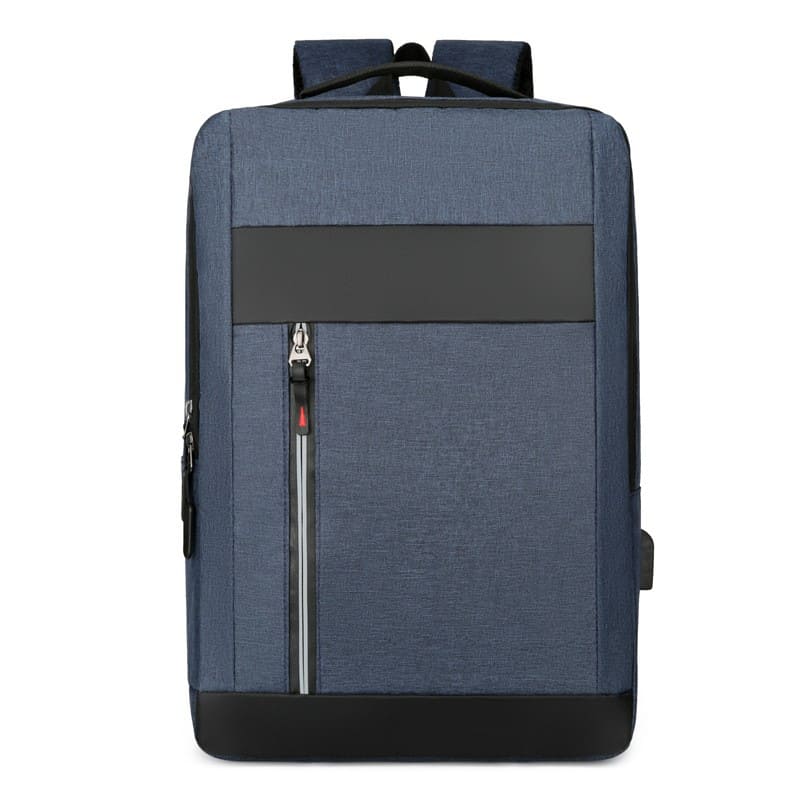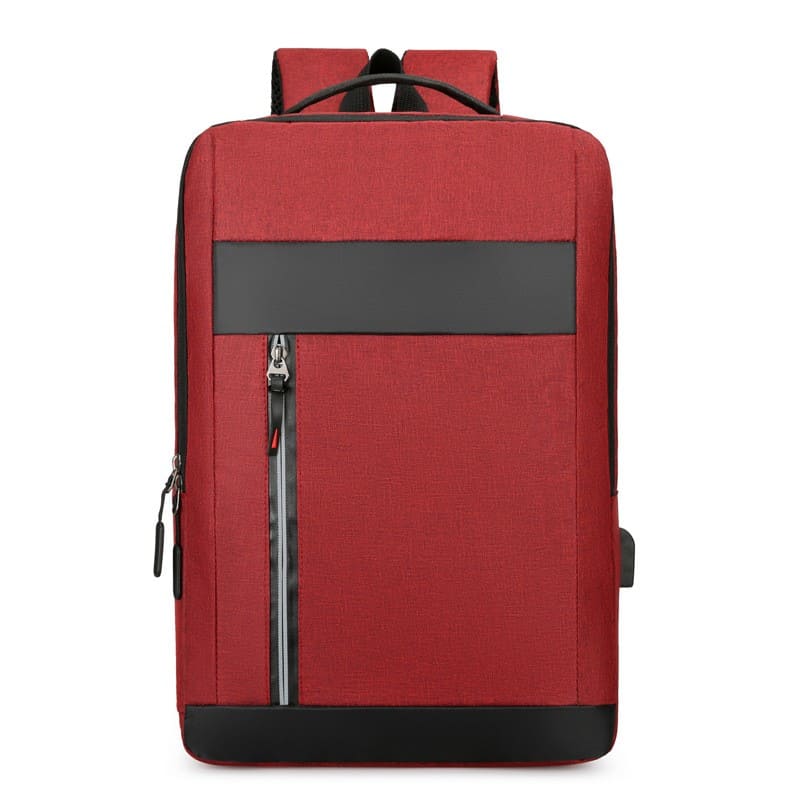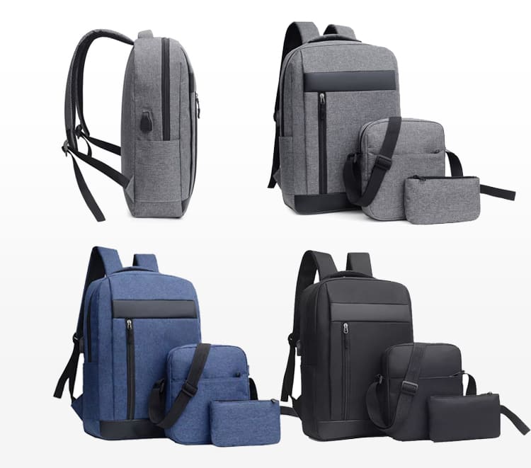 Mochila porta notebook. Presenta un bolsillo vertical en el frente con cierre. Franja superior e inferior decorativa en color negro. Un compartimiento frontal también con un cierre horizontal oculto. Compartimiento principal con cierre doble que contiene sobre el sector de la espalda el bolsillo porta notebook con sujetador con velcro con capacidad para introducir una notebook de hasta 15,6′. Hacia el frente trae cuatro bolsillos porta objetos. Interior forrado y acolchado. Salida externa USB con cable para conexión interna. Bolsillo en un lateral. Manija de sujeción superior reforzada. Correas acolchadas ajustables. Contiene una bandolera con bolsillo con cierre al frente y correa regulable. También un sobre portadocumentos.