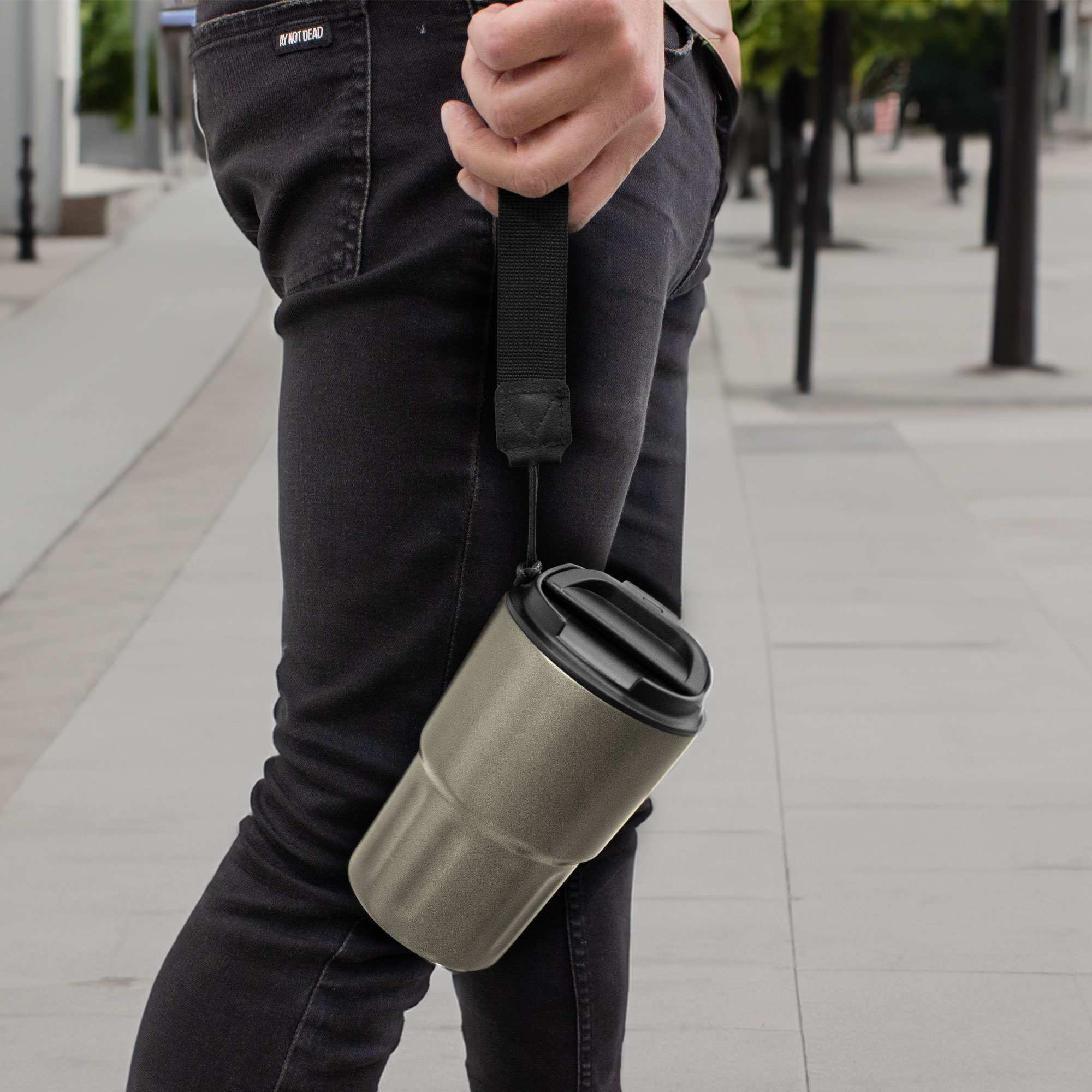 Mug doble pared, sellado al vacío. Interior en acero 304 y exterior en acero 201. Tapa de polipropileno con anillo de silicona y correa de poliéster en color negro. Pintura acabado mate. Mantiene por más de 12 hs la temperatura de las bebidas calientes y 24 hs de las bebidas frías.