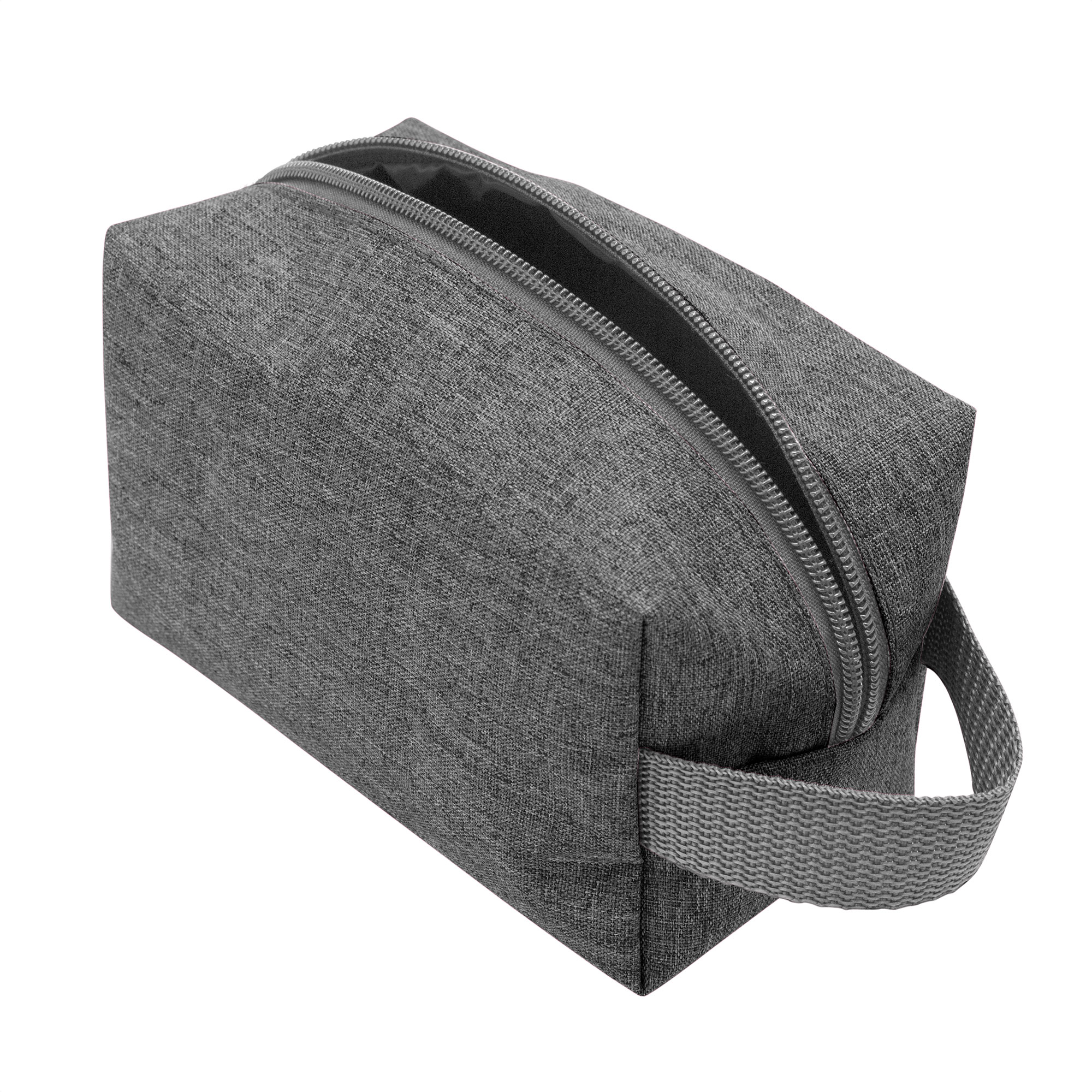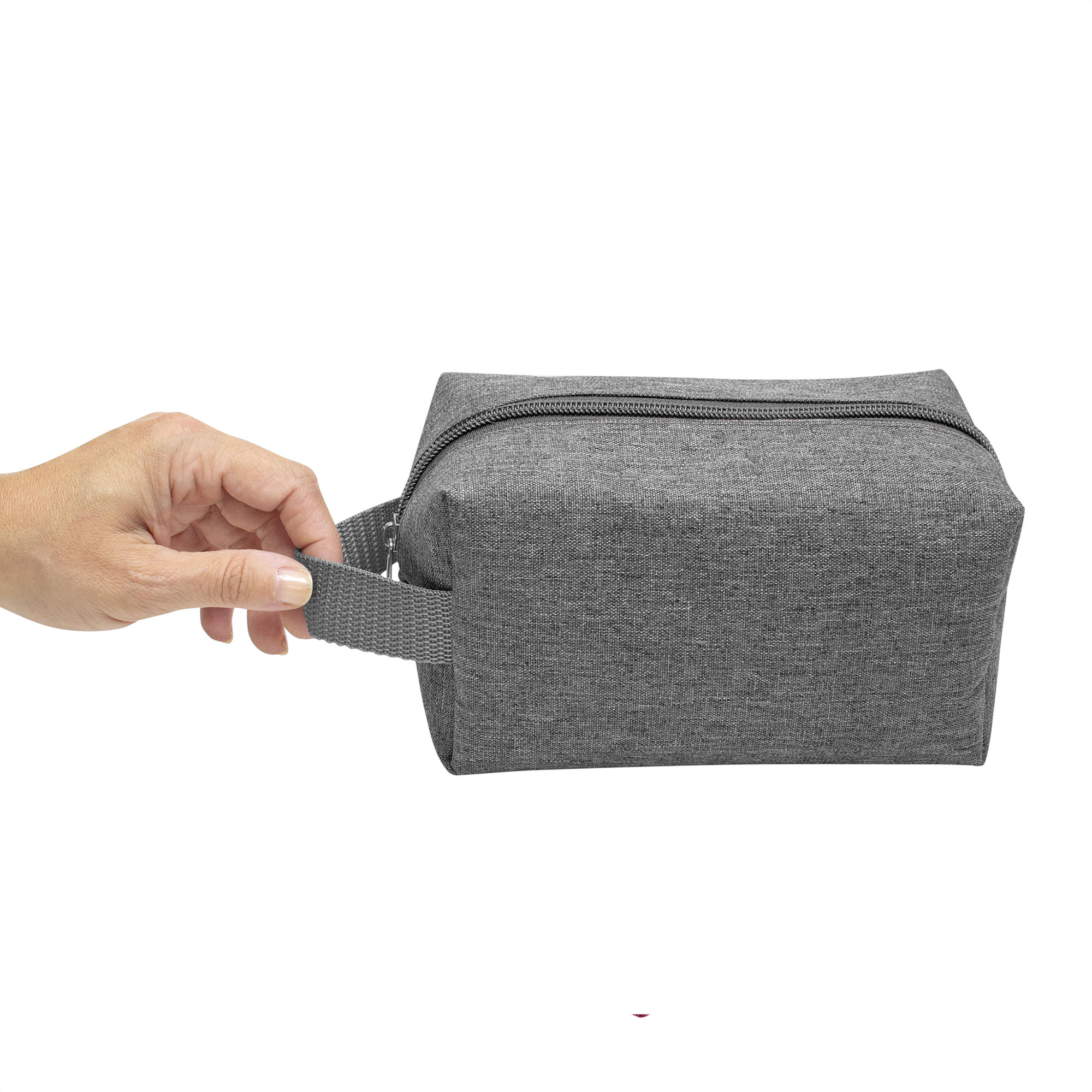 17 x 9,5 x 8 cm. Poliéster 300D. Necessaire / Cosmetiquera con amplio compartimento. Interior forrado en Poliéster 210D. Cierre con tirador metálico y asa lateral en tela de color gris.
